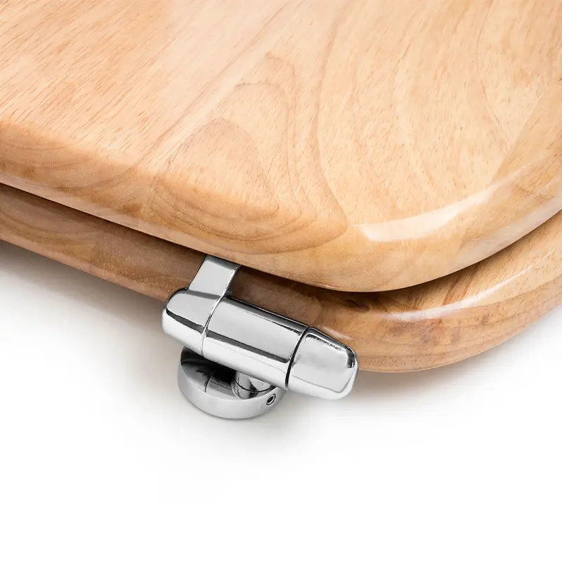 מושב אסלה מעץ אלון מעוצב עם צירי נירוסטה מתכווננים.